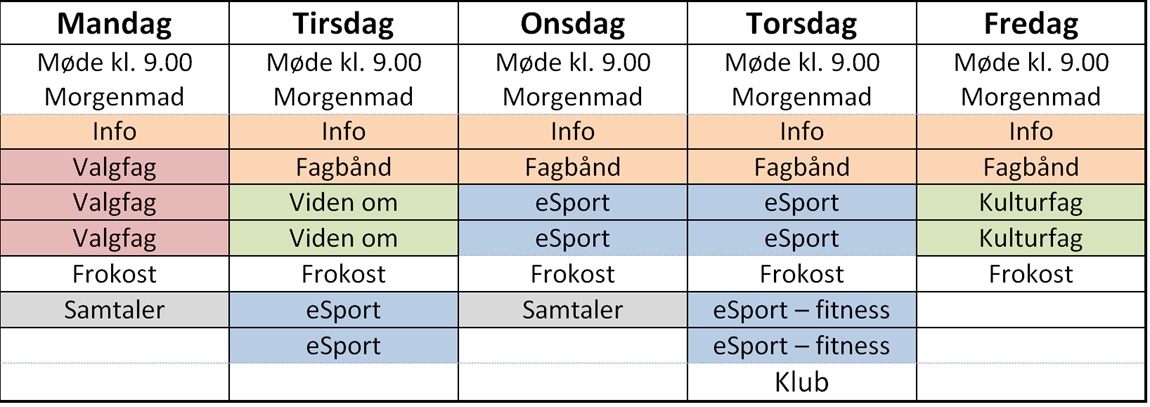 De studerende får et almindeligt STU-skema med seks timers eSport på linje om ugen og to timers fitness som valgfag. Herudover får de studerende undervisning på fagbånd, kulturfag og faget ’Viden om’, ligesom de får samtaler med en fast tilknyttet underviser og mulighed for et ekstra valgfag.
